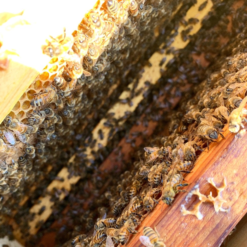 Here is a peek into a hive during an inspection to make sure things are as they should be. Beekeepers check on colonies to make sure they are healthy; the colony has a queen, a lot of bees and room for the queen to lay. There are no pest such as the small hive beetle, wax moths and varroa destructor mite and we manage in these ways. Small hive beetles eat the bees pollen source, we place cut up dry swiffer pads on top of the frames allowing them to get stuck after the bees corner them there. Wax moths eat the beeswax. We take the eaten frames out and freeze them, killing the moth and any larva. This only takes place in hives that are weak or a large swarm occurred. Then, we render that wax since it was destroyed. We also look for the notorious varroa destructor mite, who is the vampire of the bees. These mites hide in the cells of larva and feed on the fat of the developing bee, causing the new bees to not develop properly and causing deformities. We have to treat for these mites or they will destroy even the strongest of colonies.