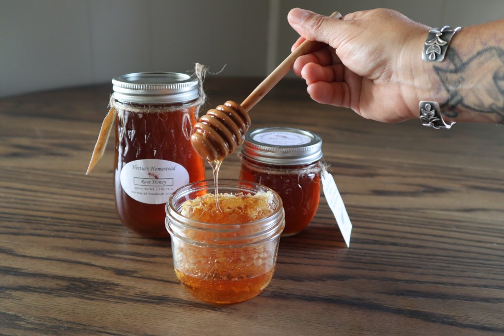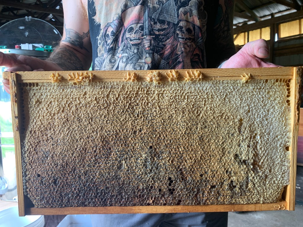 We harvest once a year before August so we can monitor and treat the hives for varroa mites. We only remove a few frames of honey per hive to ensure they have enough to get through winter. Any weak hives will be combined with stronger hives come October so everyone has a better chance of over wintering. Strong monitoring of hives are done before the first frost. We also check the weight of the hives during the winter by trying to lift the hive base. If I cannot budge the hive then they have enough winter stores, if I can move the hive I make winter sugar patties to substitute for short food storage. Bees like any other living creature eat more in colder weather to stay warm, thus it’s important to monitor honey stores before winter, which is why we don’t harvest all of the honey here on our homestead.